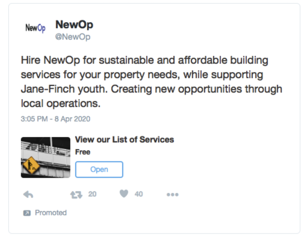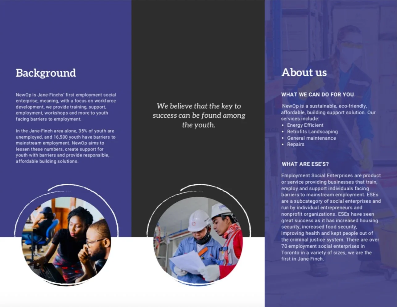 RBS was seeking a rebrand to bolster interest and spread awareness; the name NewOp was selected as it encompasses the company's ideals. The organization seeks to provide employment opportunities for multi-barriered youth ages 16-29, living in the Jane - Finch area that cannot secure mainstream employment due to personal obstacles (criminal record, homelessness, poverty etc), that are currently unemployed or not enrolled in education or training. The campaign, “Turn Obstacles into Opportunities” seeks to target potential Jane - Finch youth employees, as well as business owners and property managers, working to connect the two parties in a mutually beneficial situation.